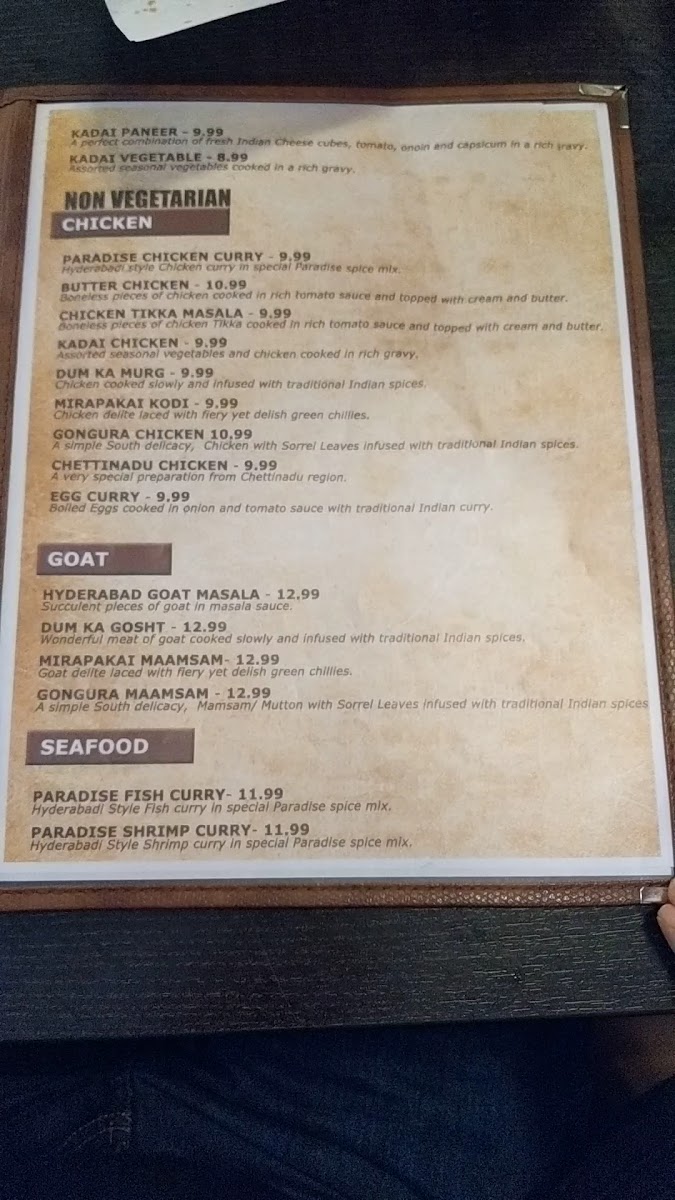 For seafood lovers, the Paradise Shrimp Curry and Paradise Fish Curry showcase the kitchen's mastery of regional spices, each at $16.79. Sides like Basmati Rice ($2.99) and Raita ($1.99) enhance your meal, balancing the bold flavors.